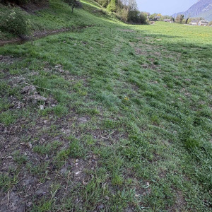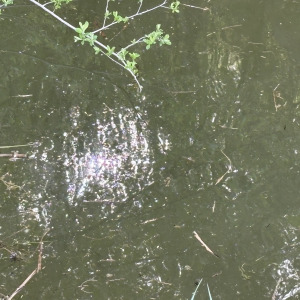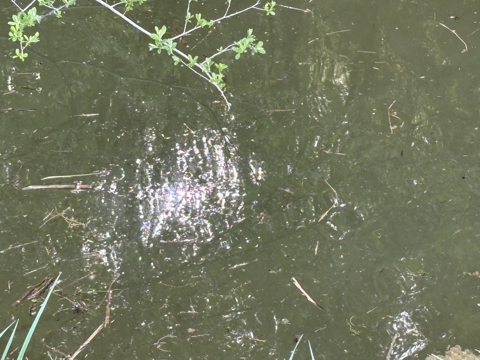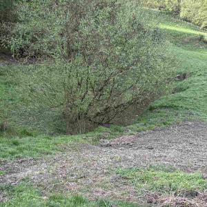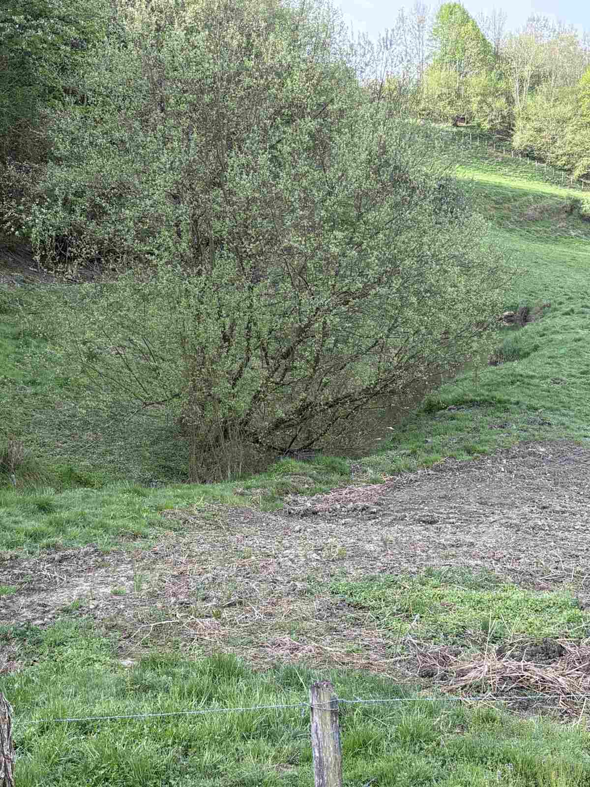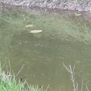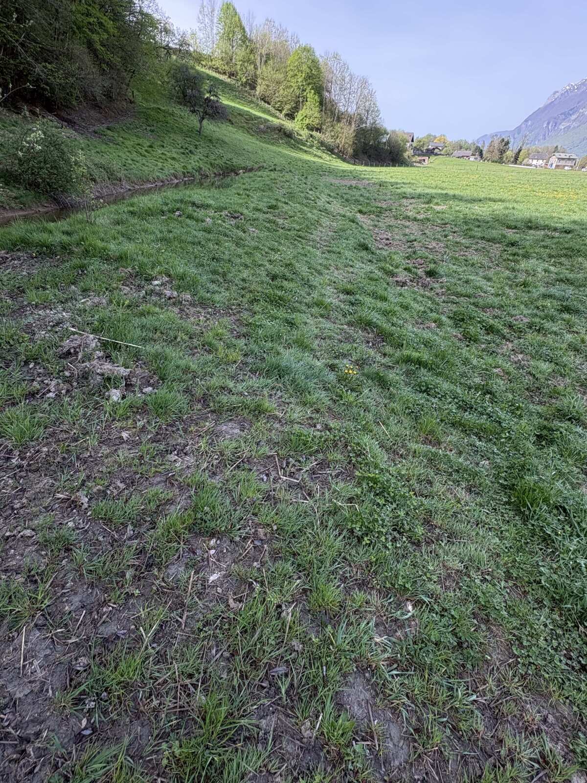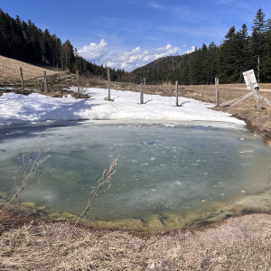 Mare artificielle, des pontes de grenouilles rousses ont été observées en dehors de la mare, à la sortie de l'exutoire dans des trous de sabots de vaches