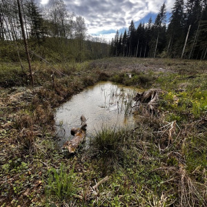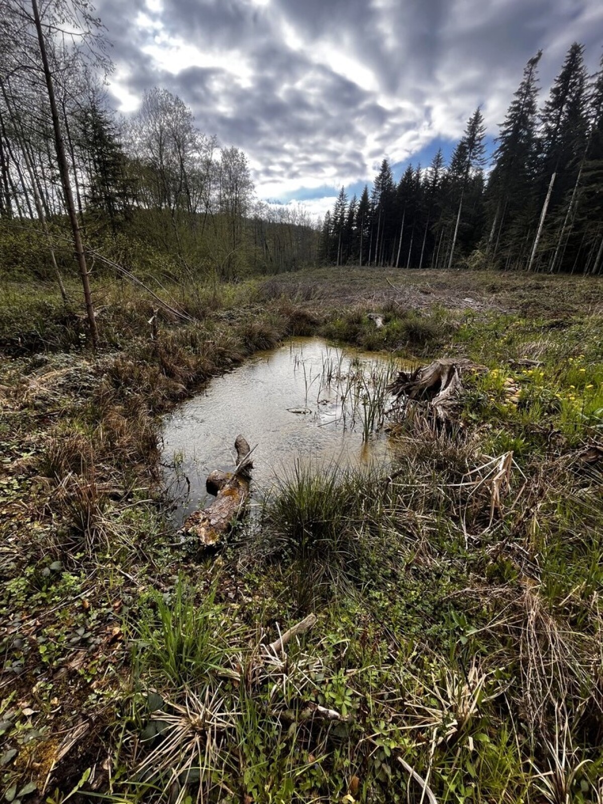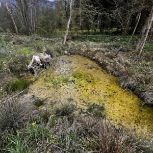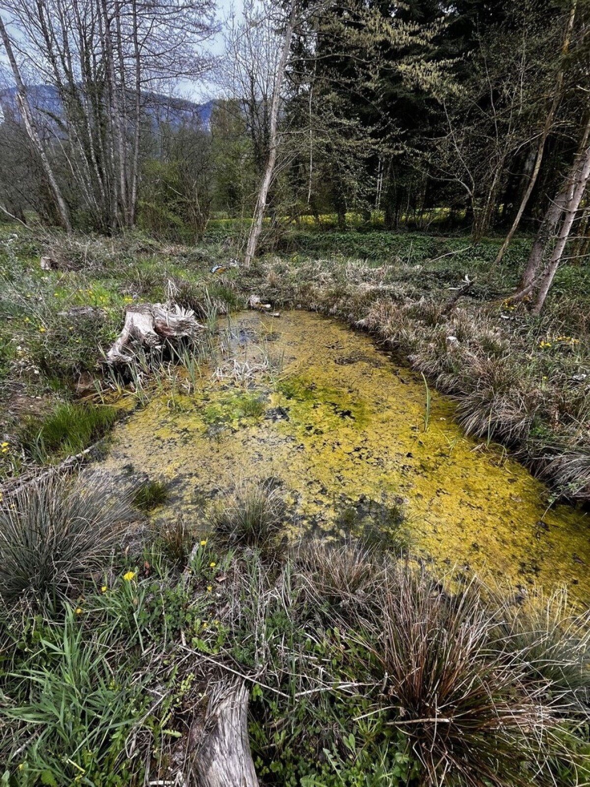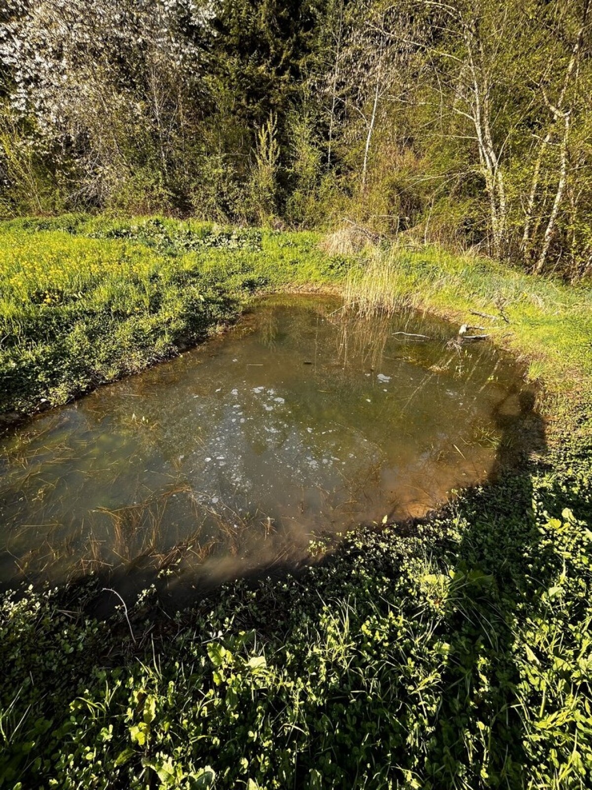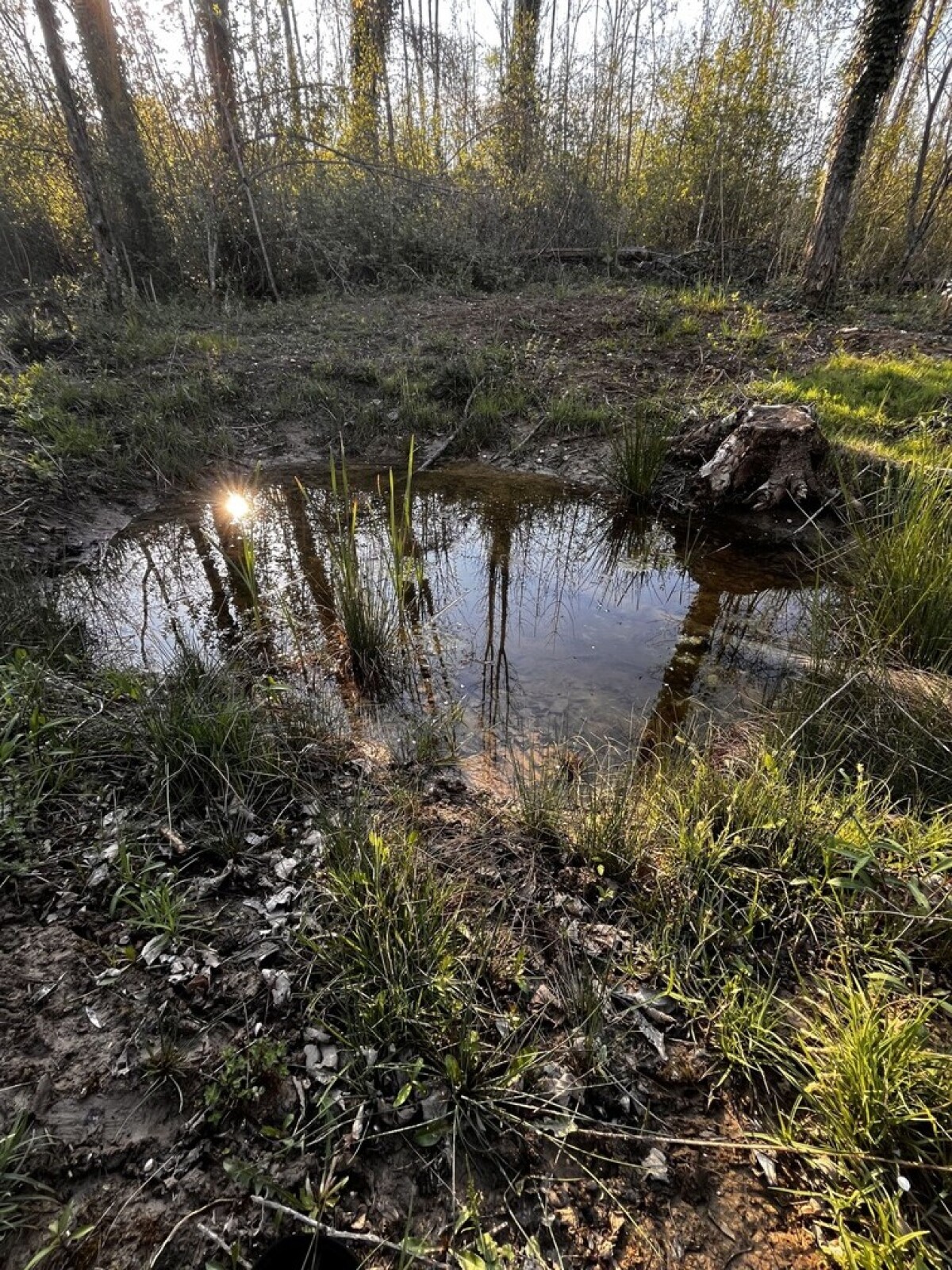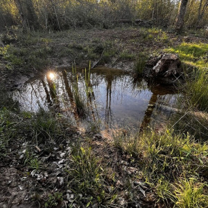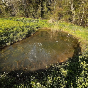 Mare peu profonde avec pas mal de végétation. Pontes de grenouilles (rousses ?) dedans