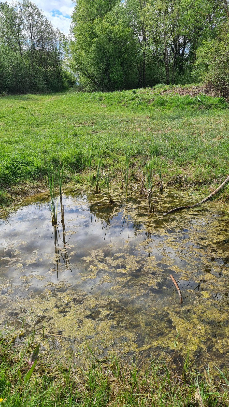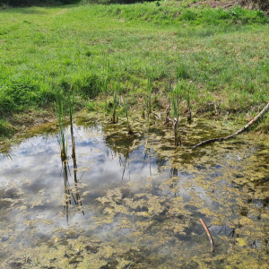 Mare forestière avec une grosse souille à sanglier et des aménagements cynégétiques