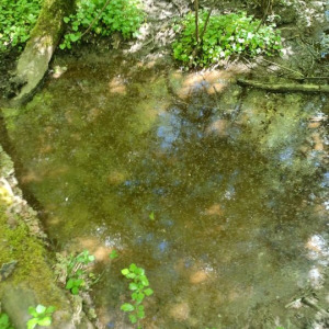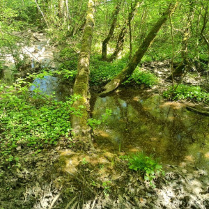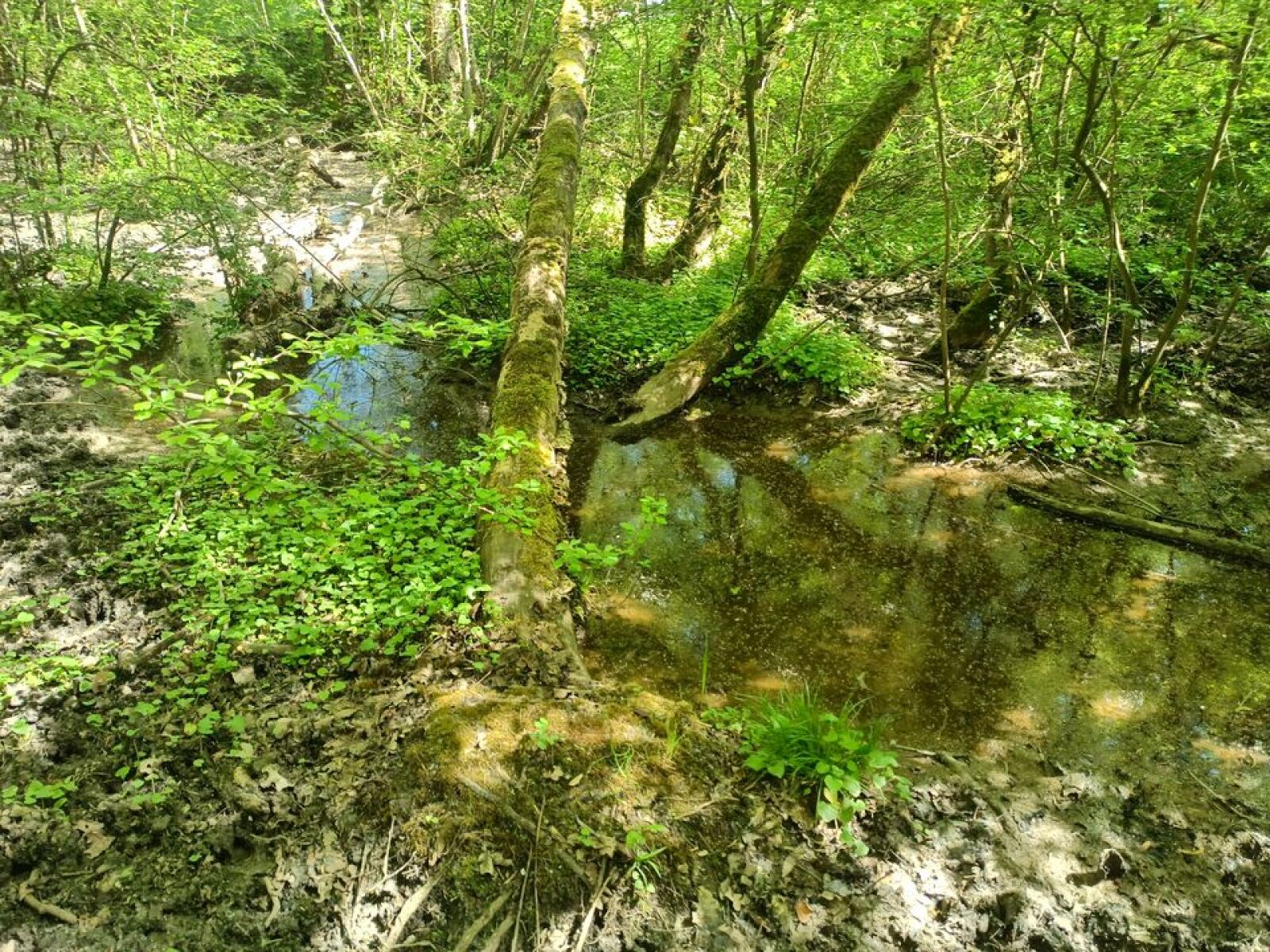 Mare forestière avec une grosse souille à sanglier et des aménagements cynégétiques