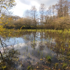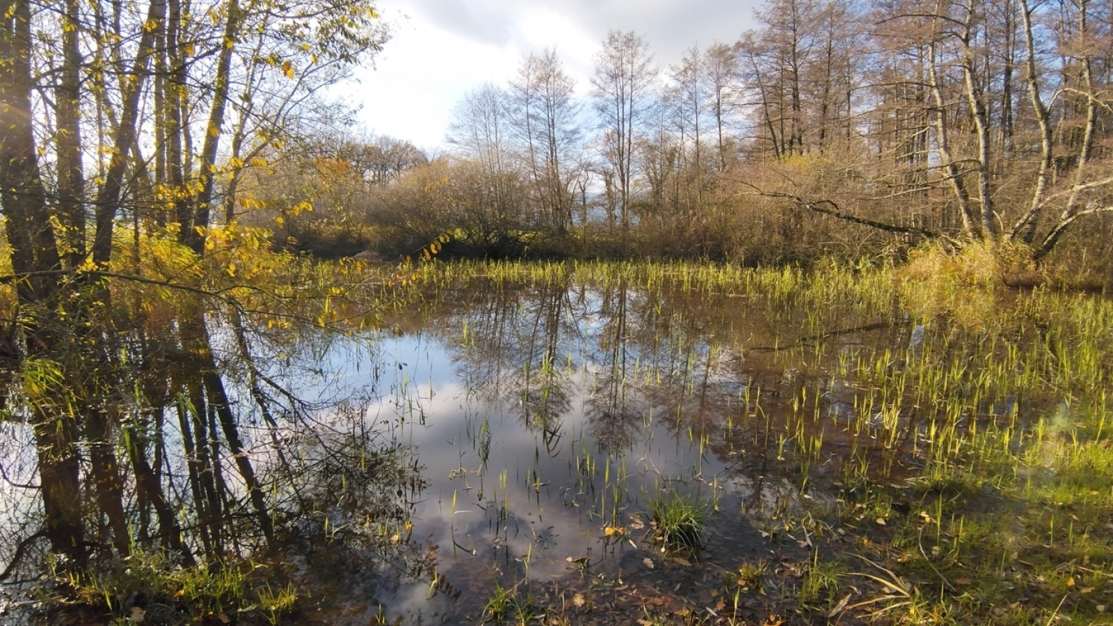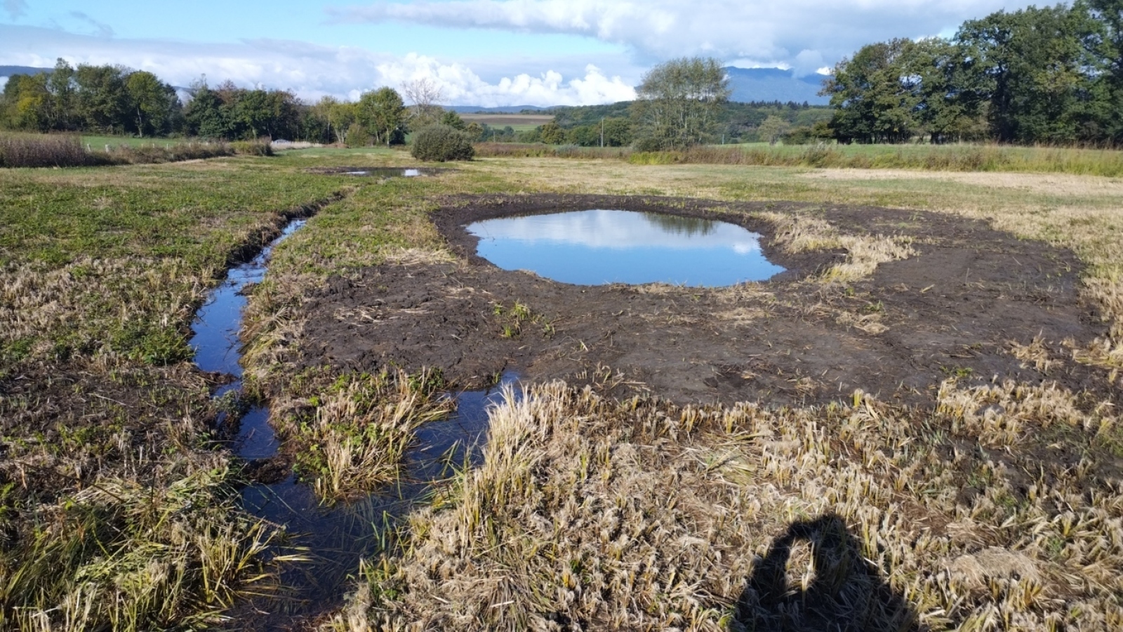 Mare située dans le marais de Bovinens, creusée en 2025 par le Syr'Usses dans un marais en partie submergé.