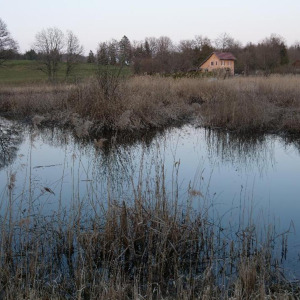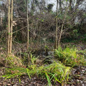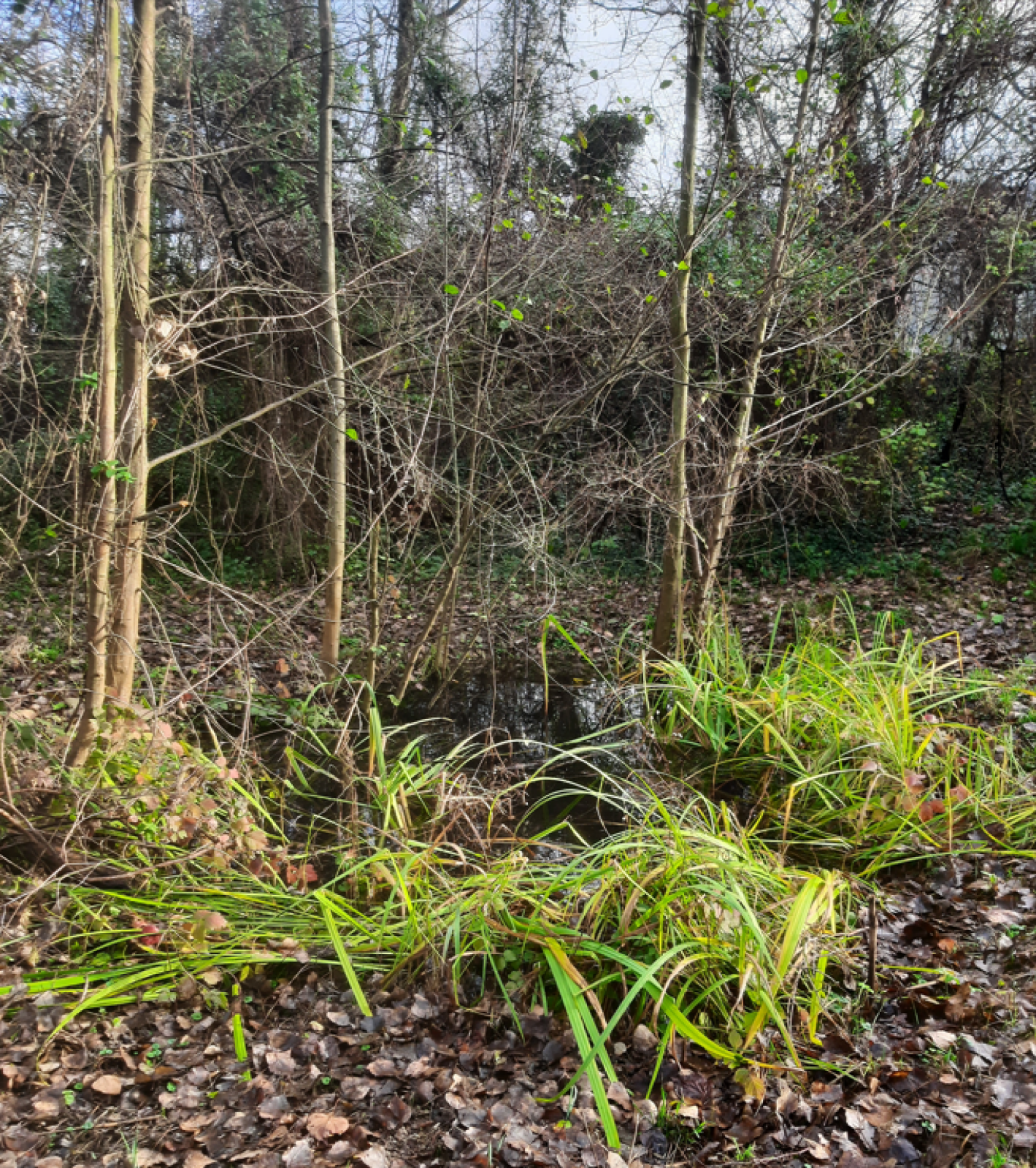 Mare creusée en 2025 par le Syr'Usses au sein d'une roselière inondée une partie de l'année et gérée depuis 2024 (réouverture par bucheronnage et broyage avec exportation)