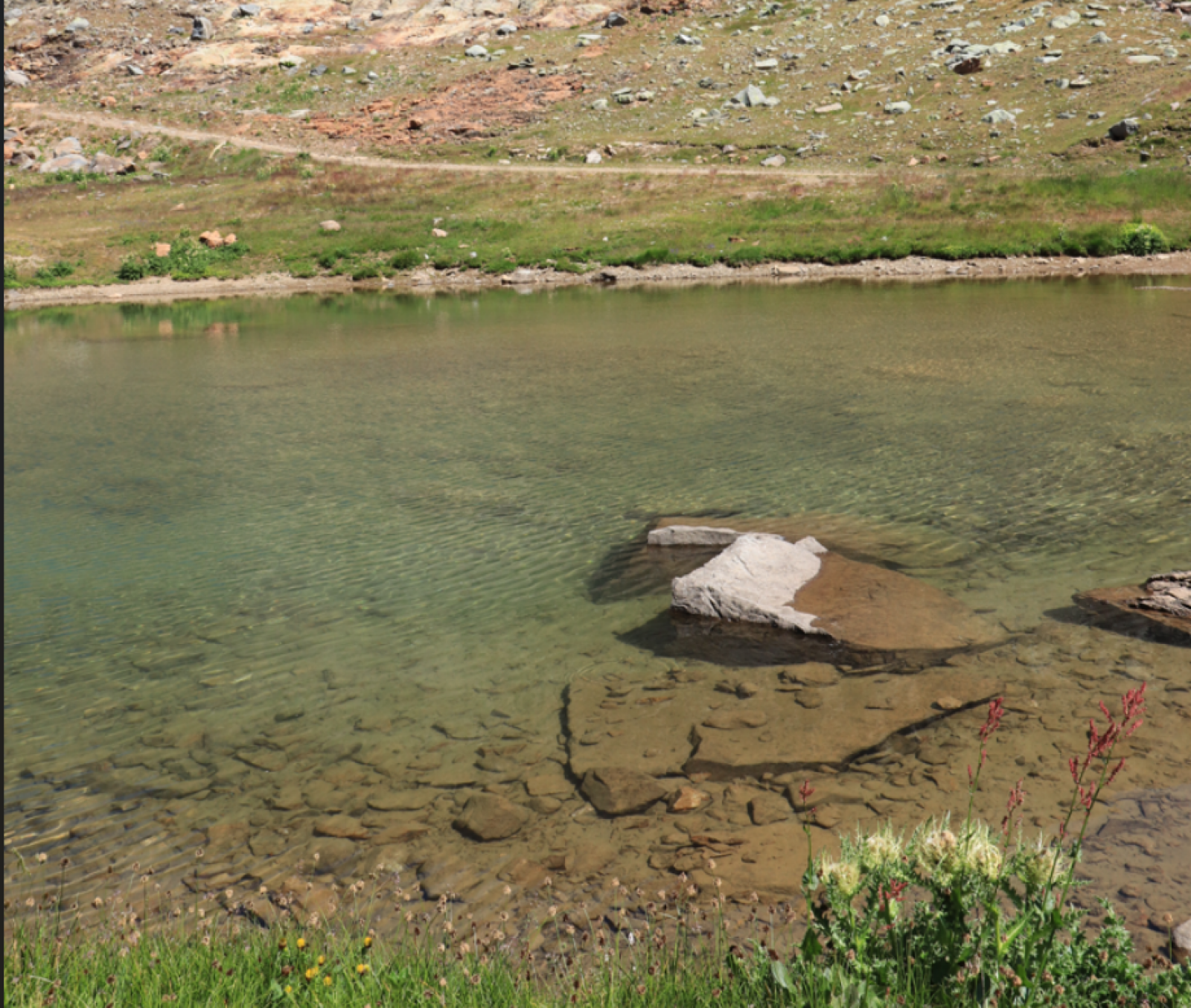 Description Dans le Massif des Grandes Rousses, au Sud du Lac Blanc à 2500m d'altitude, une zone séparée du reste du lac pour un chemin en dalles de pierres. Il y a peu de profondeur d'eau mais des Grenouilles étaient présentes. |